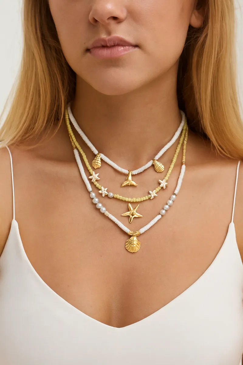 🌊 Un accesorio que respira playa y libertad. Esta multigargantilla combina elementos marinos icónicos para crear un look fresco, luminoso y perfecto para la temporada de verano.